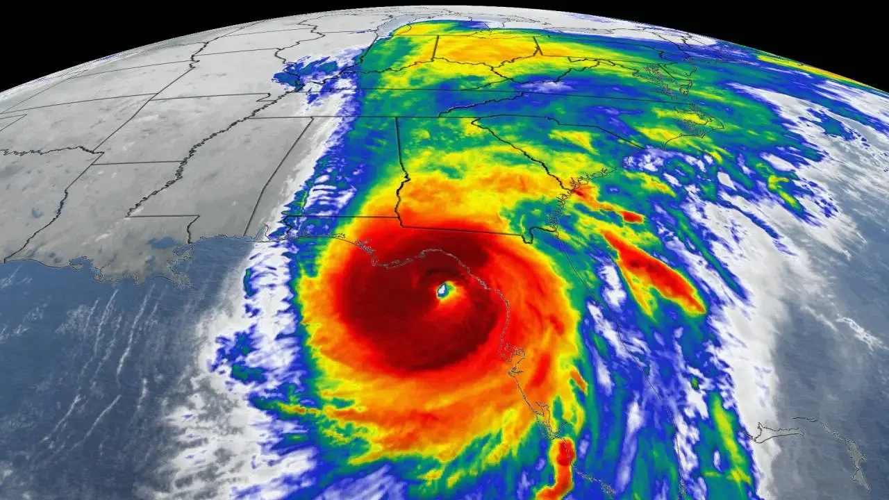 Satellite image of Hurricane Ian approaching Florida with intense spiral bands of storm clouds and heavy rain over the southeastern United States.